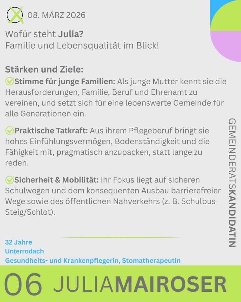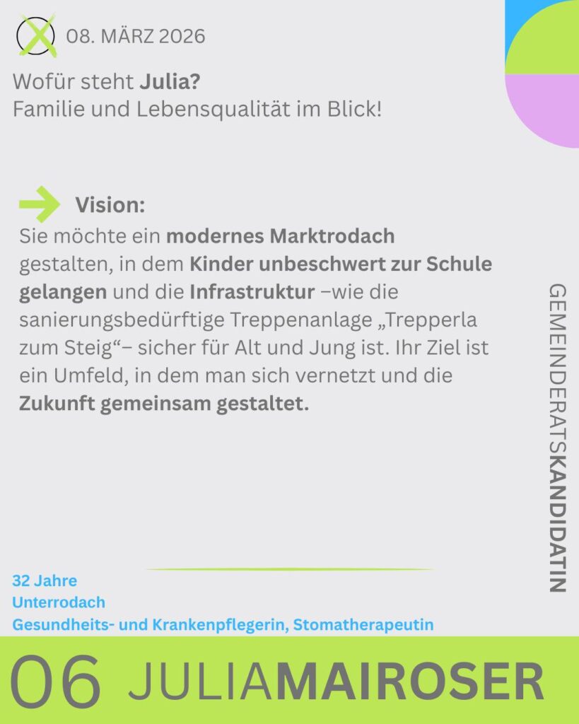 Darf es etwas mehr Tatkraft sein? Unsere Kandidatin Julia Mairoser (32) bringt als Stomatherapeutin und junge Mama genau das mit: Sie redet nicht lange, sie macht!
