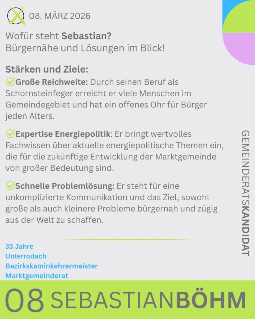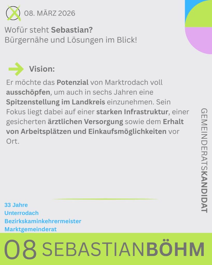 Mit seinem Fachwissen in Energiefragen verfolgt er das Ziel, Marktrodach bodenständig, gut versorgt und zukunftsfähig weiterzuentwickeln.